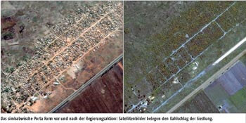 Ende Mai veröffentlichte amnesty international (ai) ganz besondere Satellitenbilder von Simbabwe. Diese belegen die vollständige Zerstörung des Armenviertels Porta Farm. Die Regierung Mugabe hat im Rahmen der Aktion „Murambatsvina“ (übersetzt aus dem Shona „Raus mit dem Schmutz“) im Mai vergangenen Jahres zahlreiche auch politisch unliebsame Stadtviertel zerstören lassen (siehe SWM 4/2006, Seite 43).