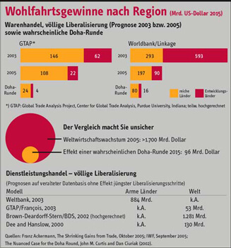 Nennenswerte Vorteile könnten sich allenfalls aus einer Liberalisierung des Dienstleistungshandels ergeben. In dieser Hinsicht unterscheiden sich die Modellergebnisse jedoch gewaltig, was allein schon Zweifel an ihrer Stimmigkeit aufkommen lässt. Da alle diese Prognosen auf einer Datenbasis von 1995 bzw. 1997 beruhen und auch die jüngsten Liberalisierungsschritte nicht berücksichtigen, müssten auch diese Ziffern um einen vielleicht nicht unerheblichen Faktor reduziert werden.