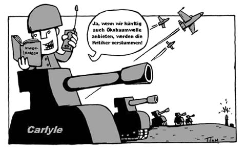 In der hiesigen umwelt- und entwicklungspolitischen Szene erfreut sich Hess Natur großer Beliebtheit. Seit vielen Jahren steht der Ökotextilunternehmer für sozial und ökologisch verträglich produzierte Textilien. Das globalisierungskritische Netzwerk Attac hat nun eine Protestaktion gegen die geplante Übernahme von Hess Natur durch den Private Equity Fonds und Rüstungskonzern Carlyle gestartet. Würde Carlyle übernehmen, landen bewusst gezahlte Extra-Euros für faire Ökokleidung auf denselben Konten wie die Erlöse aus Panzer und Minenverkauf. So versucht sich der Konzern, ein Deckmäntelchen umzuhängen.