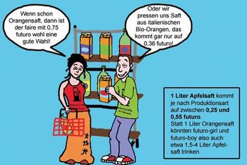 Das Projekt „futuro“ zur Erhebung eines fiktiven Preises, der Nachhaltigkeit in Form sozialer und ökologischer Kriterien berücksichtigt, wurde von SOL (Menschen für Solidarität, Ökologie und Lebensstil) vor bereits drei Jahren ins Leben gerufen. In dem innovativen Projekt musste Vieles ganz neu erarbeitet werden: die verschiedenen Kriterien zur Nachhaltigkeit und eine wissenschaftlich ermittelte Zahl, die die ökologische bzw. soziale Belastung des Produktes ausdrückt. Nunmehr gibt es erste Ergebnisse, und zwar bei Apfel- und Orangensäften.