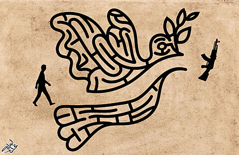 Dass die Menschen den Weg zum Krieg eher beschreiten, weil er direkter bzw. einfacher erscheint als der zum Frieden, will Karikaturist Osama Hajjaj mit dieser Zeichnung ausdrücken.
