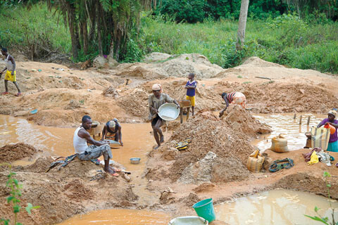 Die Mine ist eine der zahlreichen Kleinbergbau-Anlagen. Sie wird von Dorfbewohnerinnen und -bewohnern betrieben. Land gehört in Kamerun grundsätzlich und bis auf Widerruf der Regierung. Wer darauf wohnt, darf es nutzen. Im Normalfall einigt sich die Dorfgemeinschaft auf eine Arbeitsteilung. Meist bilden Familien Teams. Die Männer graben mit einfachen Spaten so tief wie möglich, denn unten ist die Erde reicher an Edelmetallen. Die Frauen und Kinder waschen und sieben dann die Erde in mehreren Stationen – im Fluss, in Schalen und Bottichen. Es ist ein langwieriger Prozess, oft genug mit wenig Ausbeute.