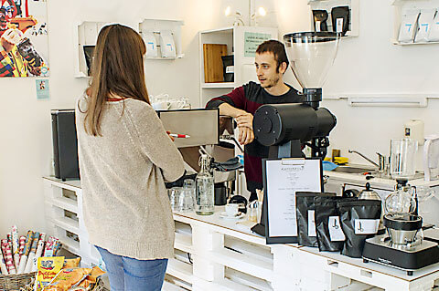 Vor zwei Jahren eröffneten Valentin Freyler und Boris Ortner das Kaffeemodul in der Josefstädter Straße, diesen September folgte ein Pop-Up-Store im Geschenkeladen Bottelini im dritten Bezirk. Sie machen guten Kaffee, den sie in Zusammenarbeit mit der Hamburger Direktimportrösterei Quijote beziehen und allein das ist ihr Konzept. Die Baristas wollen genau wissen, wer ihren Kaffee produziert hat. „Nur Leute, die ihre Arbeit halbwegs gerne machen, das Know-how haben, Zugang zu Bildung und in fairen Bedingungen leben, machen ein wirklich gutes Produkt“, erklärt Freyler seine Motivation. Und die KundInnen wissen das zu schätzen. 60 bis 70 Prozent sind Stammkundschaft, vom Schüler bis zur 90-jährigen Pensionistin, die jeden Tag mit ihrem 70-jährigen Sohn vorbeikommt. Sie eint das Interesse an der Herkunft des Kaffees und das Vertrauen in die Qualität. Dieses Vertrauen müssen auch Valentin Freyler und Boris Ortner den Direct-Tradern von Quijote entgegenbringen. Diese stellen die Kontakte zu Kooperativen her, sie überprüfen die Einhaltung der Standards, die sie selbst gesetzt haben und sie bezahlen den Preis, den sie ausgehandelt haben.
