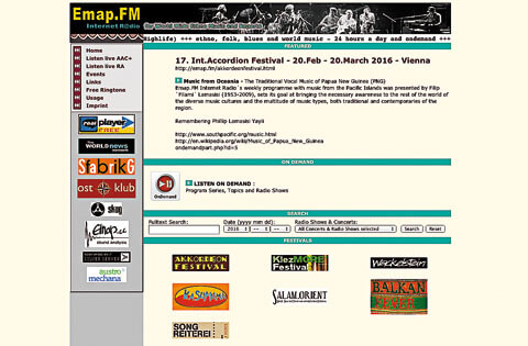 Emap.FM ist ein unabhängiges Internetradio für Weltmusik aller Kulturen, Regionen und Religionen: Gesendet wird aus Wien 24 Stunden am Tag und sieben Tage die Woche. Das tägliche Programm startet um 16.00 Uhr und wird zwei bzw. vier Tage später wiederholt. Zu hören gibt es Ohrenschmaus von Akkordeon bis Balkan, von Blues bis Klezmer, von Ozeanien bis zum Orient, Radioshows, CDs und Mitschnitte von Live-Konzerten.