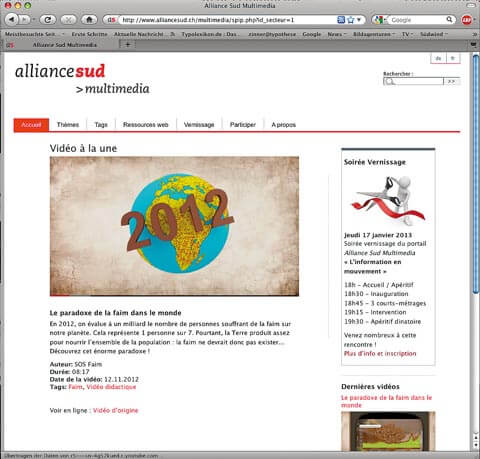 All dies ist über das Multimedia-Portal der Alliance Sud, der Arbeitsgemeinschaft der sechs großen Schweizer Hilfswerke, zu finden. Am 16. Jänner wurde es offiziell vorgestellt. Im Mittelpunkt des Portals stehen Videos. Sie sind zehn großen Themenkreisen zugeordnet, von Energie und Landwirtschaft, Politik, Kultur bis hin zu Wirtschaft und Menschenrechte. Die ausgewählten Videos, die meist zwischen fünf und zehn Minuten dauern, eignen sich für unterschiedliche Einsatzbereiche. Informativ, frech oder überraschend – die Auswahl der Filme ist originell und gut gelungen.