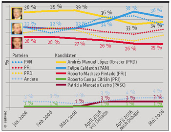 Der „demokratische Rechtstaat“ unter Präsident Vicente Fox Quesada hat es in den vergangenen sechs Jahren nicht geschafft, die Spuren der letzten Jahrzehnte der PRI-Herrschaft (die PRI, Partei der institutionellen Revolution, war 70 Jahre lang die Regierungspartei) hinter sich zu lassen oder aufzuarbeiten. Die vor allem von den StudentInnen getragenen sozialen Bewegungen in den Jahren 1968 und 1971 waren blutig niedergeworfen worden. Nach der anschließenden Epoche der Unterdrückung von Oppositionellen dachten im Jahr der Präsidentschaftswahlen von 2000 viele, dass die neue Regierung des PAN (Partei der Nationalen Aktion) den BürgerInnen mehr persönliche Freiheiten einräumen würde. Obwohl der Menschenrechtsschutz in der Verfassung und im Justizwesen gestärkt wurde und die Regierung ein nationales Menschenrechtsprogramm entwickelte, beklagen im Jahr 2006 internationale Organisationen wie Amnesty International und Human Rights Watch die katastrophale Menschenrechtslage im Land. Letztere veröffentlichte Ende Mai, also knapp einen Monat vor den Wahlen, einen Bericht über die Fortschritte und Fehler der Regierung Fox in diesem Bereich und kommt zum Schluss: „Das Fehlen von Fortschritten im Justizbereich ist insbesondere deswegen so frustrierend, weil die Bedingungen für einen echten Wandel in Mexiko tatsächlich gegeben waren.“