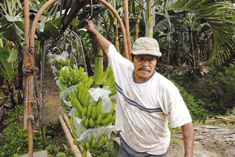 Haben Sie schon einmal gesehen, wie Bananen von den Plantagen in die Abpackstation kommen? Zuerst kontrolliert ein Arbeiter, wie lang die Bananen sind, dann schneidet er die Bananen von der Staude und hängt sie an einem Haken auf ein Drahtseil. Ganz am Anfang vor den herunterbaumelnden, zahlreichen Bananen sitzt ein Arbeiter auf einem Sessel mit Motor, der auch auf dem Drahtseil hängt. Oder der Arbeiter zieht die ganze Ladung Bananen. Das ist der so genannte „tren“, der Zug, mit dem die Bananen nun ihren Weg durch die riesigen Bananenplantagen in die Abpackstation antreten. Manchmal dauert die Fahrt 30 Minuten, da hängen sich die „Zugführer“ gerne ein Kofferradio auf, um sich die Zeit zu vertreiben. Und so kann es gut sein, dass man durch die Bananenplantage von El Guabo wandert und so einem „Bananenzug“ mit lauter Musik begegnet.