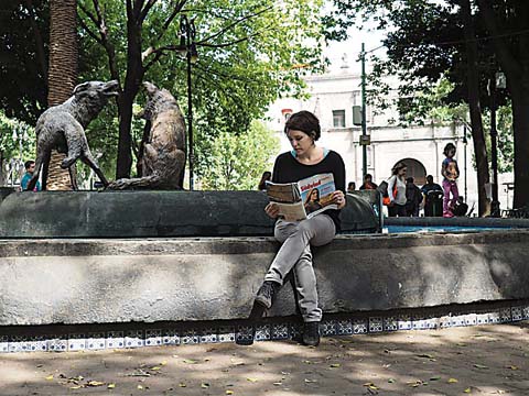 Christina Bell, bis Ende 2015 Redakteurin beim Südwind-Magazin, lebt derzeit in Mexiko-Stadt. Das Magazin darf dabei trotzdem nicht fehlen. Und was gibt es Besseres als eine Lektüre in anregendem Umfeld: Der Kojotenbrunnen im Park Jardín del Centenario ist der Namensgeber des Stadt-Bezirks Coyoacán, wo unter anderem Frida Kahlo, Diego Riviera und Leo Trotzki viel Zeit verbrachten.