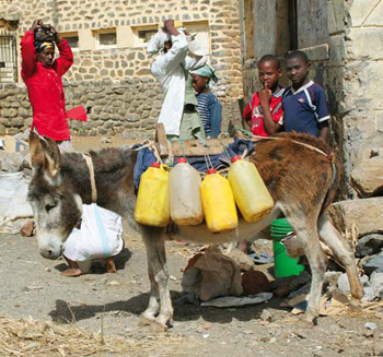 Kaum ein Gebrauchsgegenstand hat das Leben in Afrika so verändert wie der Plastikkanister. Nach wie vor muss Wasser meist über große Strecken nach Hause getragen werden. Die leichten Kanister in allen Größen und Ausführungen erlauben es, dass Kinder zum Wasserholen herangezogen werden. Diese Hilfe stellt eine große Unterstützung der Frauen dar, deren Aufgabe das Wasserholen in der Regel war. Und auch die endlosen Schlangen von Kanistern vor der Wasserstelle sind ein gewohnter Anblick. Hier vertreten die Kanister ihre BesitzerInnen, die inzwischen auf dem Markt einkaufen oder Bekannte besuchen und so das stundenlange Warten sinnvoll nutzen.