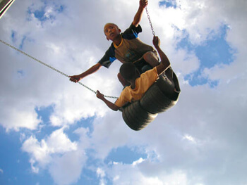 Ein weiteres Projekt, das den Geist von Cascoland treffend beschreibt, sind die Kinderschaukeln des deutschen „Müll-Architekten“ Jan Korbes. Kaum am Drill Hall angekommen, war ihm klar, wie wertvoll dieser Platz in einer Umgebung sein könnte, in der Kinder sonst auf den viel befahrenen Straßen spielen müssen. So begann er, fünfzehn Schaukeln aus alten Autoreifen herzustellen.