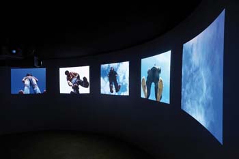 Ein abgedunkelter, halbrunder Raum, auf der schwarzen Wand fünf Filmprojektionen. Auf den Bildflächen scheinen Menschen zu schweben – eine Frau, ein Mann, ein Mann mit Kind. Sie müssen auf einer Glasplatte stehen, einer transparenten Fläche. Die betrachtende Person sieht den Grund nicht, auf dem sie stehen. Sie sieht ihre Fußsohlen, sieht sie von unten, als ob sie aus einem verglasten Raum nach oben in den Himmel schaute, und auf dem gläsernen Dach stehen Leute, sitzen, suchen mit den Füßen tastend nach Halt. Sie bewegen sich vorsichtig, schwanken – oder ist es die eigene Verunsicherung angesichts der ungewohnten Perspektive, die sie schwanken scheinen lässt? Über ihnen nur blauer Himmel und Wolken, als ob sie zwischen Erde und Himmel schweben würden. Auf einer Bildfläche ist nur leerer Himmel. Sie singen mehr neben- als miteinander dasselbe Lied.