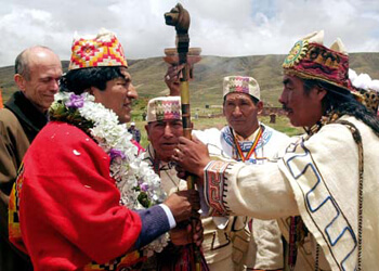 Einer, der sich als Nachkomme dieser Andenkulturen begreift, steht nun am 21. Jänner hier im Licht, umringt von Schamanen, die ihn symbolisch zum Herrscher küren. Am Tag darauf wird er in La Paz offiziell zum Präsidenten der Republik Bolivien ernannt. Er ist der erste regierende Indio seit einem halben Jahrtausend. Vor ihm liegt der schwierigste Spagat seines Lebens: Er muss einen „Zusammenstoß der Kulturen“ in einen „Dialog der Kulturen“ überführen, sonst bricht Bolivien auseinander.