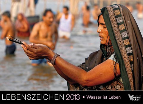 Das nächste Jahr kann kommen: „Wasser ist Leben“ lautet das Thema des neuen Bildkalenders „Lebenszeichen 2013“ der Gesellschaft für bedrohte Völker (GfbV). Ob im arktischen Eismeer oder im tropischen Regenwald, in der ausgedörrten Savanne, an den Ufern gewaltiger Ströme oder auf kleinen Inseln in hoher See – welch facettenreiche Rolle das Wasser für den Menschen spielen kann, präsentiert der Kalender eindrucksvoll in großformatigen Bildern. Jeder Monat zeigt eine andere Szene vom Globus: von den Inuit im hohen Norden über die Küstenfischer in Westafrika bis hin zu den Papua in Ozeanien.