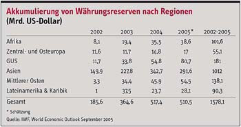 Ein Merkmal dieser Entwicklung ist die Zunahme der Währungsreserven (siehe Tabelle). Allein zwischen 2002 und 2005 stiegen sie um fast 1600 Mrd. US-Dollar – zum Großteil in Asien, aber auch in Lateinamerika. Im Dezember 2005 etwa beschlossen Argentinien und Brasilien, sich per Rückgriff auf ihre Währungsreserven dem Kuratel des IWF zu entziehen: Die Regierung in Buenos Aires zahlte ihren IWF-Kredit von 9,6 Mrd. Dollar vorzeitig zurück, während Brasilien 2006 vorzeitig 15,5 Mrd. Dollar rücküberweisen will.