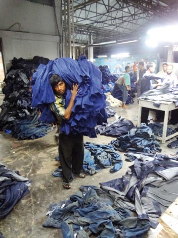 Zum Artikel Bangladesch / Bekleidungsindustrie Dieser Mann trägt den ganzen Tag die schweren Hosen in einer Jeanswäscherei von einem Arbeitsvorgang zum nächsten. Von Bangladesch / Bekleidungsindustrie Ohne Abo lesbar Artikel lesen