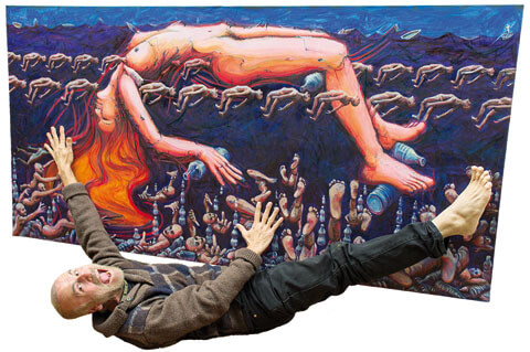 Zum Artikel Kunst: Antonio Zapata malt gegen Ungerechtigkeit. Vor der Personifikation Europas zeigt Zapata Von Kunst: Antonio Zapata malt gegen Ungerechtigkeit. Ohne Abo lesbar Artikel lesen