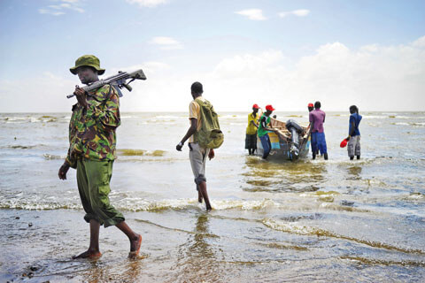 Zum Artikel Kenia: Kampf um die Fische im Turkana-See. Begleitschutz für Fischer: Wegen der Bedrohung durch Bewaffnete fahren kenianische Milizionäre mit aufs Wasser. Von Kenia: Kampf um die Fische im Turkana-See. Ohne Abo lesbar Artikel lesen