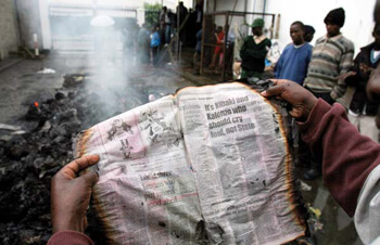Bestürzt waren die KenianerInnen am 2. März dieses Jahres, als mit Kalaschnikows bewaffnete Vermummte in das Gebäude der Zeitungsgruppe „The Standard“ eindrangen. Auch der Fernsehsender KTN, der zum selben Konzern gehört, war betroffen. In dem einen Haus fackelten die Vermummten tausende Zeitungen ab, in dem anderen stellten sie vorübergehend den Sendebetrieb ein, schleppten Computer und Sendeequipment hinaus. Die Aktion, von Innenminister John Michuki angeordnet, war eine Reaktion auf Berichte über ein Geheimtreffen zwischen Präsident Mwai Kibaki und einem früheren politischen Gegner. Der Zeitung wurde „Veröffentlichung falscher Gerüchte mit der Absicht, die Öffentlichkeit in Panik zu versetzen“ vorgeworfen. Der britischen BBC gegenüber sagte Michuki, die Razzia sei im Sinne der nationalen Sicherheit angeordnet worden und meinte: „Wenn man eine Schlange schüttelt, muss man damit rechnen, von ihr gebissen zu werden.“ Kurz zuvor waren drei Minister zurückgetreten, nachdem einige kenianische Journalisten Korruptionsskandale enthüllt hatten. Die Informationen darüber waren ihnen offensichtlich aus Regierungskreisen selbst zugespielt worden.
