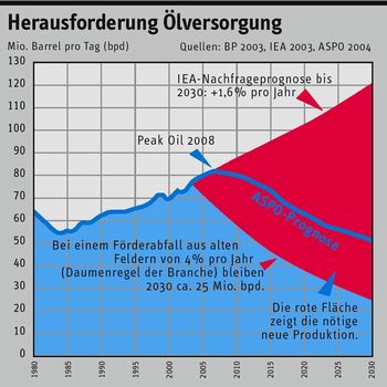 Dass die Welt nach Branchenangaben (Ende 2002) über mehr als 1.000 Mrd. Barrel sicher förderbare Reserven an konventionellem Öl verfügen dürfte (inkl. Erdgaskondensate), die theoretisch bis mindestens 2030 reichen, ändert daran überhaupt nichts. Diese Daten gaukeln eine Sicherheit vor, die nicht existiert: Sie suggerieren, man könnte diese Reserven bei wachsender Nachfrage einfach rascher herausholen, und das bis zum letzten förderbaren Tropfen – eine ziemlich realitätsfremde Vorstellung.