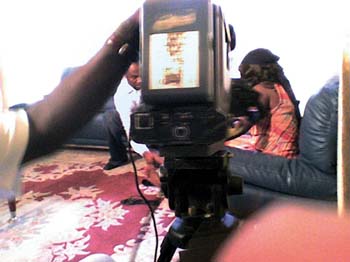 Die Ausstatterinnen richten sich mit einem Haufen Kleider auf dem Bett im Schlafzimmer ein, Edok im Wohnzimmer, um ihre Perücke zu kämmen und sich zu schminken. Ein Helfer stellt neben dem Fernseher ein paar Bilderrahmen mit Fotos der SchauspielerInnen auf. Zwei Lampen kommen in die eine Ecke, eine Digital-Kamera in die andere. In Nollywood wird nur in ganz wenigen Ausnahmen auf Zelluloid-Film aufgenommen. Die Szene wird zweimal trocken durchgeprobt, dann wird gedreht. Einmal von nah, einmal von fern. Nach dem Filmen werden die zwei Perspektiven zusammen geschnitten. Und wie man in vielen Nollywood-Filmen beobachten kann, bleiben oft auch die Szenen drinnen, in denen sich die SchauspielerInnen verhaspelt haben. Nur Schweiß will der Regisseur nicht tolerieren. Wenn ein bisschen davon auf Edoks Stirn glänzt, ruft er sofort: „Cut. Ini, du schwitzt schon wieder.“ Dann eilt einer der Helfer herbei, tupft ihr die Stirn und verschwindet wieder.