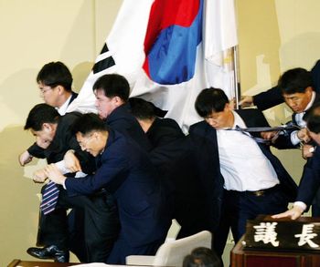 Nach monatelangem Tauziehen hat es die parlamentarische Opposition Mitte März geschafft, den amtierenden Präsidenten Roh abzusetzen. Stein des Anstoßes war ein eher geringfügiger Verstoß gegen das Wahlgesetz: Der Präsident hatte bei einer Pressekonferenz einige unterstützende Worte für eine Partei geäußert.