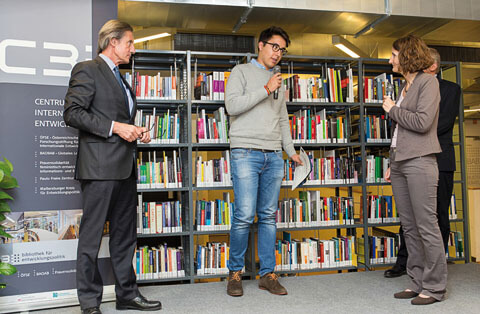 Aaron Calzadilla, Fabian Kriechbaum, Helene Hanel und Sonja Hofstetter erhielten die Auszeichnung für ihre herausragenden vorwissenschaftlichen Arbeiten im Bereich Internationale Entwicklung. Diese schriftlichen Arbeiten sind wesentliches Element der so genannten „neuen Matura“, die in Österreich seit 2015 abgehalten wird. Das Thema dafür wird von den SchülerInnen selbst gewählt. Bei Interesse an internationaler Entwicklung, finden sie in der C3-Bibliothek für Entwicklungspolitik in Wien eine ideale Anlaufstelle.