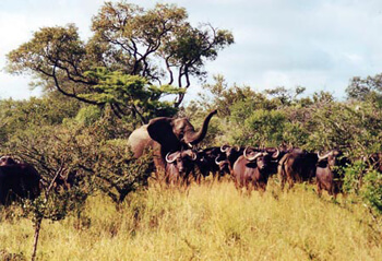 Wutschnaubend bricht der riesige Elefantenbulle aus dem Busch. Keine 15 Meter vom Auto entfernt beginnt er, Furcht einflößend zu trompeten und nähert sich aufgeregt dem vermeintlichen Rivalen. „Bleibt’s ganz ruhig, der greift nicht an.“ Alois Haberhauer, der die Dickhäuter im Krüger-Park seit langem studiert, bleibt ruhig und erhebt nicht einmal die Stimme. Tatsächlich bleibt der Bulle abrupt stehen und trollt sich wieder in den Busch. Dort macht er weiter ziemlichen Lärm, rollt sich am Boden und bricht einen armdicken Baumstamm entzwei, als ob er ein Streichholz wäre.