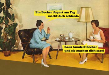 Unlängst, in einem österreichischen Supermarkt. An der Kassa wird mein Blick von einem großen, an die Wand drapierten Bilderstreifen angezogen. Zwei Frauen, blond, weiß, jung, schlank, die Köpfe lachend zusammengesteckt. Eine Frau und ein Mann – weiß, jung, schlank, etc. -, die sich über einen angedeuteten Einkaufswagen hinweg lächelnd küssen. Ein Paar Beine, die mit hohen Absätzen und Strumpfnaht einem angeschnittenen Einkaufswagen hinterher stöckeln. Und im letzten Bild zwei Frauen – weiß, jung, schlank, blond -, die lachend einen bis über den Rand vollen Einkaufswagen über den Asphalt schieben. Das heißt, eher wandern sie leichtfüßig dem sanft gleitenden Wagen hinterher, als dass sie sich mit Einsatz von Körperkraft gegen sein offensichtlich beträchtliches Gewicht stemmten.