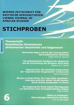 Schwerpunkt der letzten Ausgabe ist das Thema Rassismus. Der brasilianische Soziologe Valter Roberto Silverio stellt die These von der „biologischen Durchmischung“ des gesellschaftlichen Lebens in Brasilien als einen idealisierenden Mythos dar, der durch die Alltagspraxis widerlegt wird. Der Politologe Simon Kravagna hat Verfahrensprotokolle und Gerichtsurteile in Zusammenhang mit der „Operation Spring“ studiert, jener Großrazzia Ende Mai 1999, mit der das „nigerianische Drogen-Kartell“ in Österreich zerschlagen werden sollte. Er kommt zum Schluss, dass es sich dabei um ein staatliches Konstrukt handelte, dessen Existenz durch die empirischen Fakten keineswegs belegt werden kann.