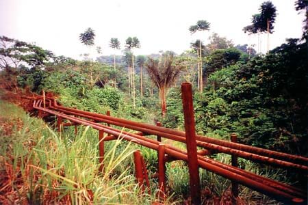Die kanadische Erdölfirma EnCana, ehemals Alberta Energy Company, hat bereits mit den ersten seismographischen Tests auf der Suche nach neuen Fundstätten begonnen. Wir blicken auf nackte Erdhügel an hellen Lichtungen im ansonsten düsteren Regenwald. Im 50-Meter-Abstand hat EnCana damit eine Linie quer durch das Tierschutzgebiet gezogen. Alles legal. Schließlich ist früher die Erlaubnis erteilt worden, in diesem mittlerweile geschützten Gebiet nach Erdöl zu bohren. Ein bis heute ungelöster Konflikt.