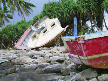Am felsigen Strand von Katukurunda liegen noch die Bootskadaver: Rümpfe und Heckteile von Fischerbooten, die vom Tsunami erfasst und gegen die Felsen geschmettert wurden. Der Bug eines großen Bootes, an einer Palme vertäut, dient als Erinnerung an den unvergesslichen Morgen des 26. Dezember 2004, als die große Welle kam, die allein in Sri Lanka über 31.000 Menschen in den Tod gerissen hat.