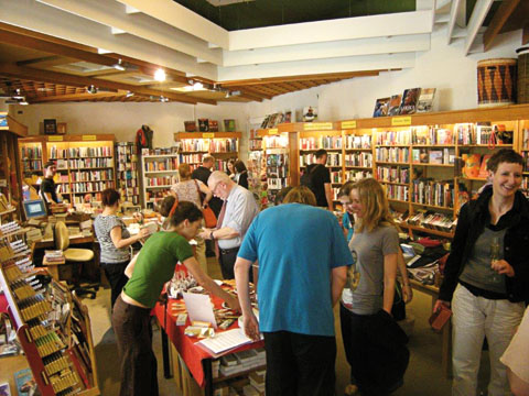 Und wenn uns dann eine Kundin, wie Anfang Juni geschehen, versichert, wir seien für sie dreißig Jahre internationale Kultur in Wien – da wird man schon leicht verlegen. Und wenn uns VerlagsvertreterInnen sagen, dass auf Grund einer unserer Buchempfehlungen der Absatz auch in anderen Buchhandlungen steigen würde, oder wir hätten wieder einmal von einem „schwierigen“ Titel oder einer unbekannten Autorin mehr Bücher verkauft als die restlichen Buchhandlungen in Österreich zusammen, dann gratulieren wir uns zu unseren KundInnen (wirklich!). Denn die wagen oft den viel zitierten „Blick über den Tellerrand“.