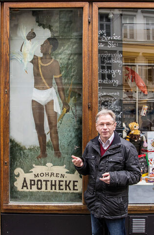 Wer mit Sauer spaziert, dem wird bewusst, was er im Alltag an historischen Spuren übersehen hat. „Wir haben alle verlernt, genau hinzusehen.“ Aber erst dadurch, dass der Historiker den Kontext von einst mitliefert – fundiert und gleichzeitig geistreich –, werden die afrikanischen Spuren so richtig spannend. Da macht es gar nichts, dass manche „Funde“ mit freiem Auge schwer bis gar nicht zu erkennen sind. Wie die afrikanische Figur in der Deutschordenskirche in der Singerstraße in Wien, die wegen des spärlichen Lichts in der Kirche und der Entfernung zum großräumig abgesperrten Altarbereich in der Dunkelheit verschwindet. Selbst auf dem Foto des Altars, das Sauer vorsorglich für den Rundgang mitgebracht hat, erkennen nur manche TeilnehmerInnen etwas. Andere runzeln nur die Stirn. Egal, es gibt ja Sauer: Laut dem Historiker handelt es sich bei der Figur um eine Darstellung aus dem 16. Jahrhundert, die einen Afrikaner als Zeugen des Todes Christi porträtiert. Damals hieß das so viel wie: Afrika gehört zu „uns“.