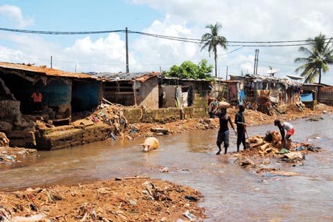 Kadiatu Kamara steht im Fluss, der mitten durch Kroo Bay fließt, einen Slum in Sierra Leones Hauptstadt Freetown. In der Regenzeit ist das Wasser über die Ufer getreten. Große Pfützen und schlammige Wege erinnern auch noch Wochen später daran. Im Moment spült der Fluss alles an, was irgendwann einmal ins Wasser geworfen wurde: halb verrottete Ananas, leere Blechdosen, kaputte Flipflops, Kot. Mitten im Wasser stehen ein paar Schweine, die mit ihren Rüsseln untertauchen und nach etwas Essbarem suchen. Ab und zu kotet eines ins Wasser. Alltag in Kroo Bay.