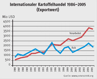 Kartoffeln werden weltweit, aber insbesondere im Süden fast ausschließlich für den Inlandsmarkt produziert. Nur ein kleiner, wenn auch wachsender Teil der Weltproduktion (zuletzt etwa sechs Prozent) wird exportiert. Die lukrativeren Teile dieses Geschäfts, nämlich Saatkartoffeln und verarbeitete Kartoffelprodukte, sind eine Domäne von Unternehmen der reichen Länder. Mit der Ausfuhr von Produkten wie Kartoffelmehl, Kartoffelflocken, Chips und Tiefkühlware (v.a. Pommes frittes) wurde 2005 beinahe doppelt so viel verdient wie mit dem Export von Rohkartoffeln.