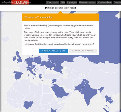 NutzerInnen können auf trackography.org auswählen, welche Nachrichten sie lesen und dann auf einer Karte beobachten, wie sich ihre Informationen durch das Netz bewegen. Wer etwa auf orf.at geht, nimmt dabei sechs so genannte „unbeabsichtigte Verbindungen“ in Kauf, bei tele.at sind des schon 25. Wer in Deutschland den Spiegel Online liest, sendet Daten über den eigenen Browser und sein Surf-Verhalten gleich an 37 andere Instanzen. Sie wandern über die Niederlande, Großbritannien, Dänemark, Spanien und die USA. 90% aller Nachrichten-Websites weltweit routen ihre Daten über US-Infrastruktur. Einige deutsche Nachrichten-Websites leiten ihre Daten über Indien, das derzeit überhaupt kein Datenschutzgesetz hat.