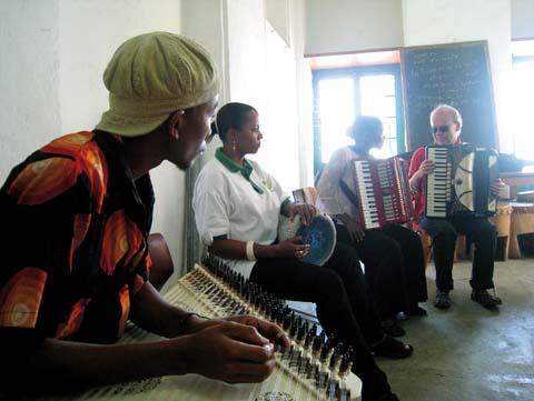 „Diese Weltreisen…“, seufzte Otto Lechner an einem der Workshop-Tage, als er aus dem Proberaum auf den Gang der DCMA trat. Er zündete sich eine Zigarette an und lächelte zufrieden. Hinter ihm lag eine gute Stunde intensiven Musizierens mit lokalen Musikern, mit den Windhund-Gefährten Karl Ritter und Melissa Coleman, sowie mit einer Sängerin, die gemeinhin und zurecht als „lebende Legende“ bezeichnet wird. Bi Kidude ist von beeindruckender Erscheinung. Ihr Alter wird auf zwischen 80 und 120 geschätzt, sie ist elegant gekleidet und in ihrer Stimme klingen große Gefühle wie Liebe, Sehnsucht und Leid mit, aber auch Selbstbewusstsein, Kampfgeist und koketter Humor. In Sansibar wird sie angebetet, ebenso wie am Festland, wo selbst die Jüngsten wissen, wofür Bi Kidude steht.