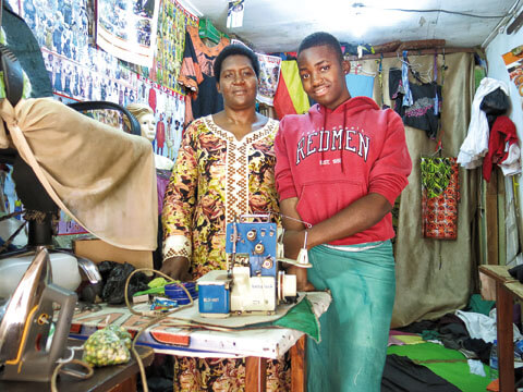 Guter Beruf. Die Schneiderin Pauline Nabukeera klemmt ein Stück bunten Stoff unter den Fuß ihrer Nähmaschine und tritt mit ihrem eigenen Fuß das Pedal an. Mit feinen Stichen näht sie den Ärmel eines Kleides an, das eine Kundin für eine Hochzeitsfeier bestellt hat. Nabukeeras 17-jährige Tochter Patricia Nabunna sitzt daneben, schneidet das Tuch zurecht, aus welchem der Rock gefertigt werden soll.