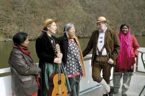 Die fast spiegelglatte Oberfläche der Donau scheint wie ein silbernes Band im grünen Flusstal, das in den ersten zarten Frühlingssonnenstrahlen sanft glitzert. Langsam und gemächlich tuckert das kleine Schiff „Lilofee“ durch die diesige Morgenstimmung stromaufwärts, dem Höhepunkt der Veranstaltung entgegen. Mit an Bord ein bunter Haufen an FlusstalbewohnerInnen, unter ihnen die Künstlerinnen Philomina Tirkey und Elizabeth Bara aus dem indischen Bundesstaat Jharkhand sowie Bulu Imam, der dort den Widerstand gegen den zerstörerischen Kohleabbau koordiniert (siehe Interview).